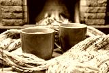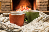 Cozy scene near fireplace with cups of hot tea and cozy warm scarf.
