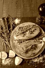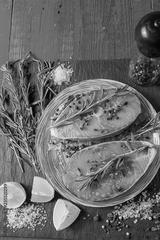 salmon fish on a plate with spices, olive oil and lemon before cooking, vertical.