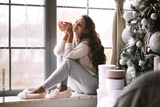 Nice dark-haired girl dressed in pants, sweater and warm slippers holds a red cup sitting on the windowsill of a panoramic window in the room next to the New Year tree and gifts