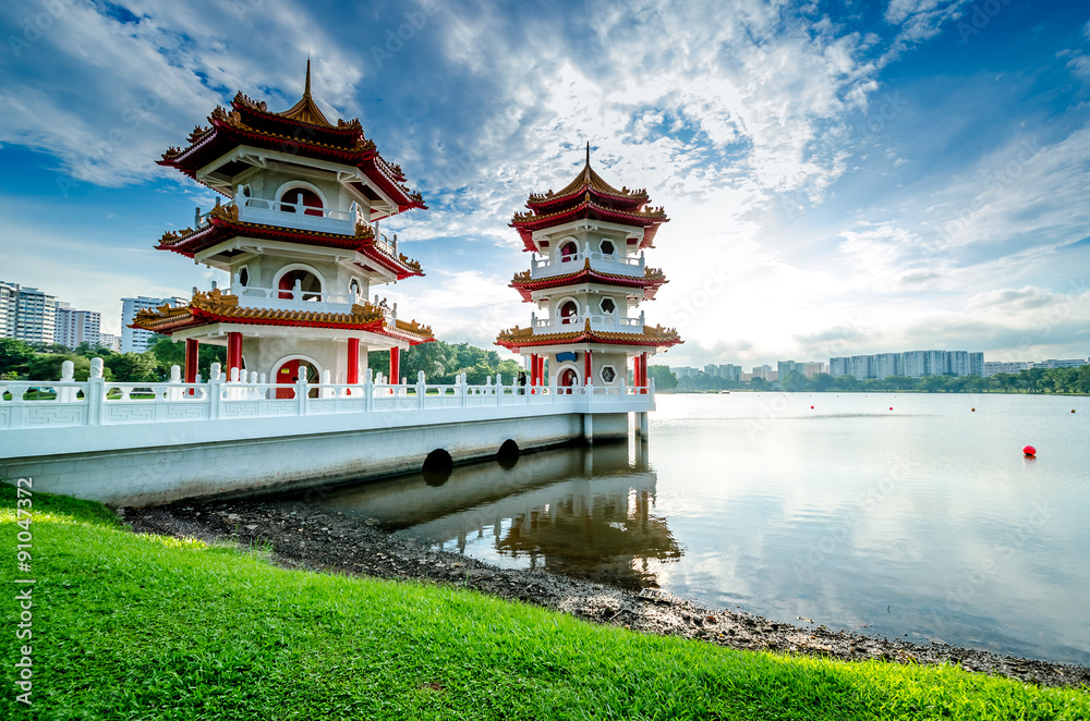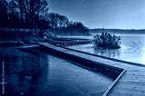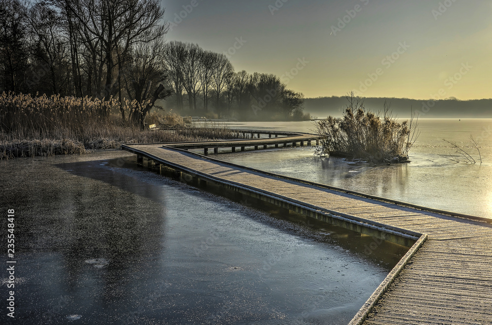 Wooden walkway covered with hoarfrost zigzagging across lake Kralingse Plas in Rotterdam, The Netherlands