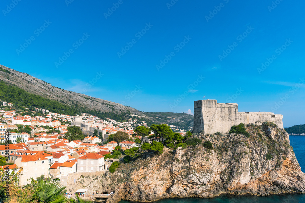 Croatia. Dubrovnik. Panoramic view of the old town and the fortress on the rock