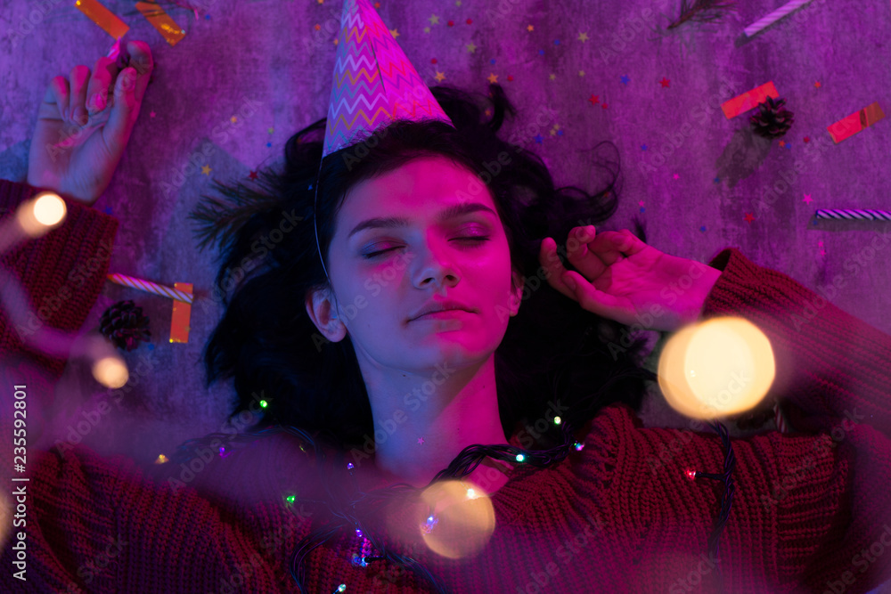 Young woman lying with glowing lights Celebration, Holiday, Birthday.