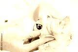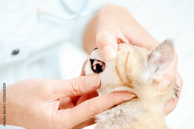 Veterinarian examining teeth of kitten.