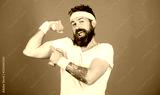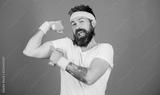 Man bearded athlete exercising dumbbell. If you want to be strong. Motivated athlete guy. Sportsman retro outfit training blue background. Join my sport class. Athlete training with cute dumbbell