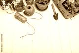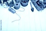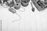 Spring flower muscari and narcissus in pot with garden inventory