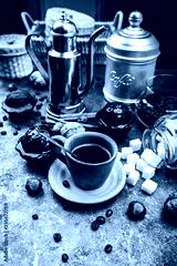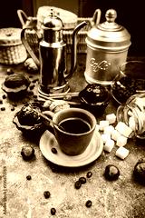 Crafting coffee in clay cup with bean cezve and chocolate cake
