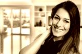 Close up beautiful woman smiling in home. Blurry background.