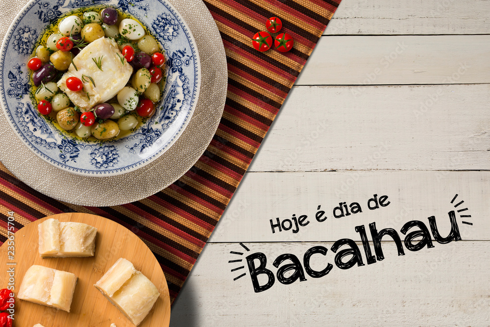 A typical Portuguese dish with codfish called Bacalhau do Porto in a original portuguese plate seen from above with copy space. Today is cod day written in Portuguese