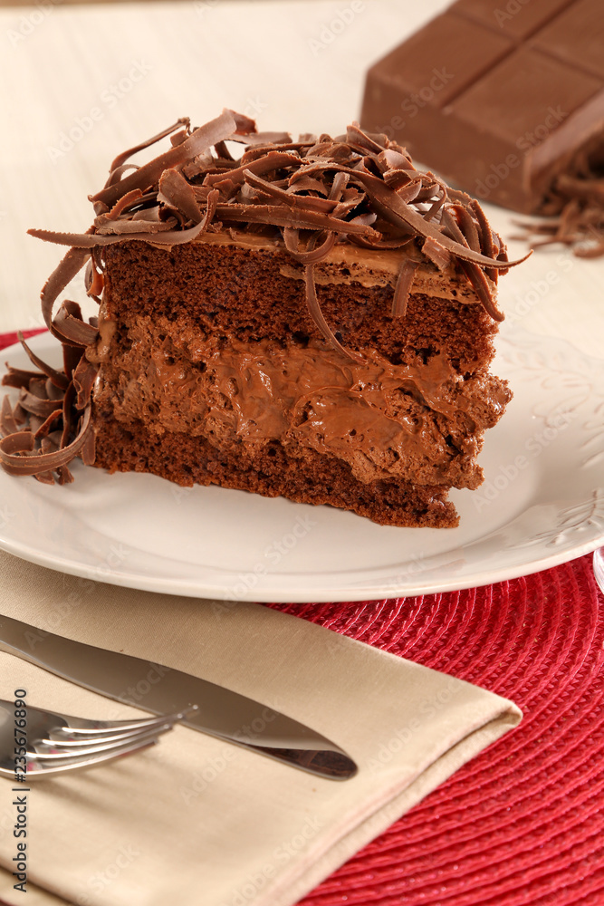 Macro close up of appetizing dark chocolate cake with out of focus cake in background.