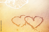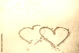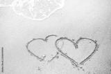 Drawing of heart and sea wave on sand on the seashore, toned. Bright background by St. Valentine's Day, the romantic image
