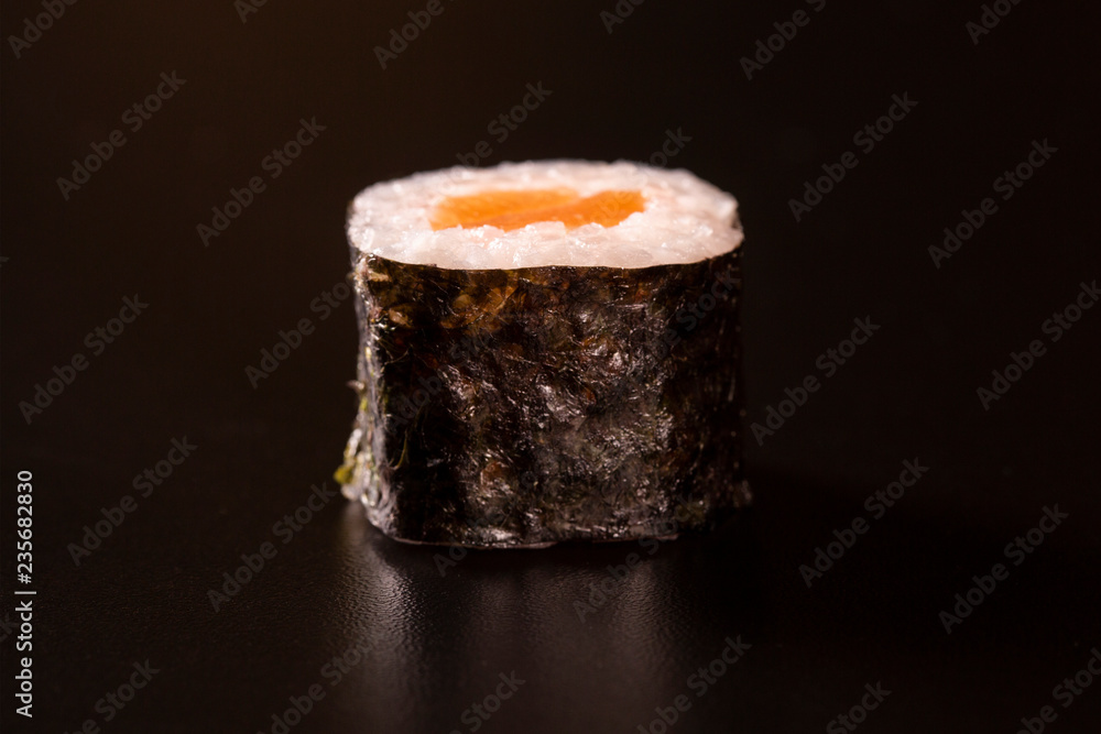Japanese cuisine. One peace of sushi roll isolated on black background Closeup shot