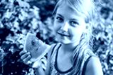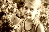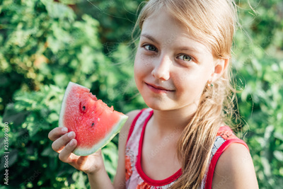 Funny portrait of adorable blonde little girl eating watermelon outdoors