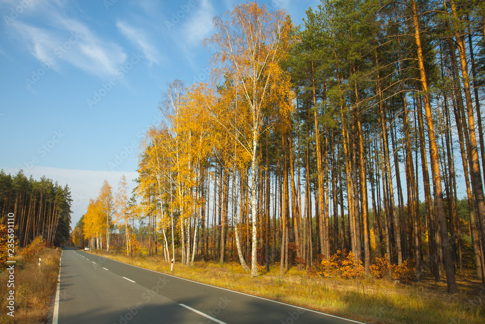 Gold birch trees and pines illuminated by the sun. The road in а forest. Calm sunny day.