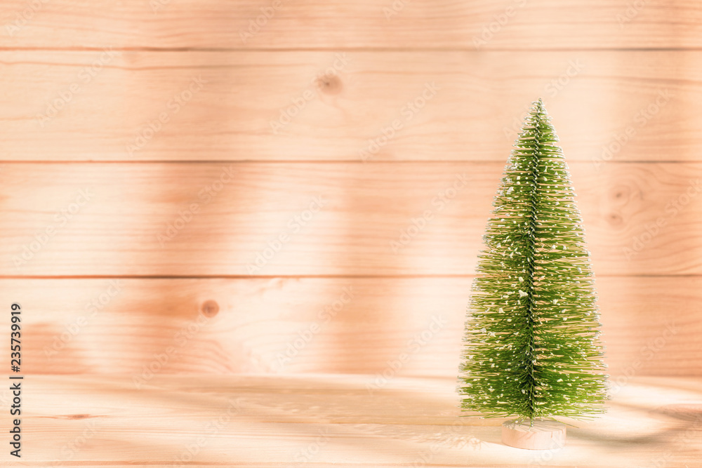 Small artificial fir tree on wooden background