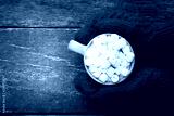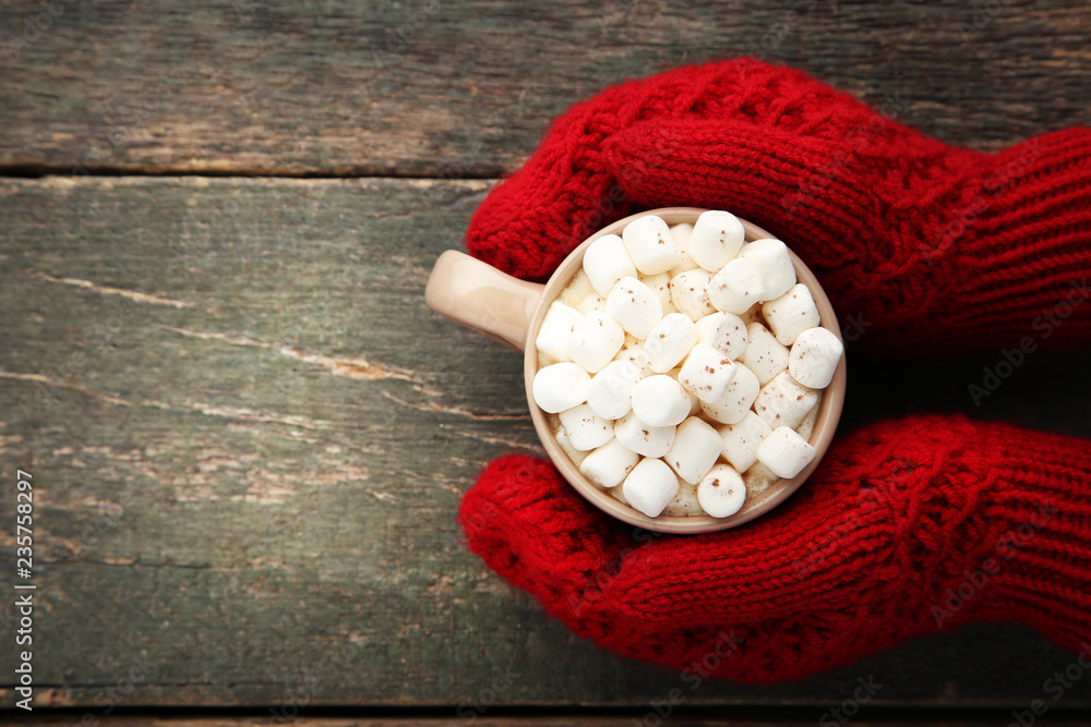 Hand in red gloves holding cup of coffee with marshmallow