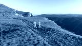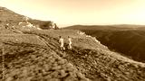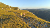 AERIAL: Young couple runs up a grassy hill overlooking the picturesque valley.