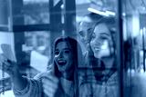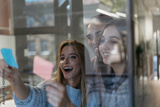 Creative team of happy multiracial developers using sticky notes for effective working process. Group of business colleagues meeting, collaborate, strategy planning, researching information. Scrum.