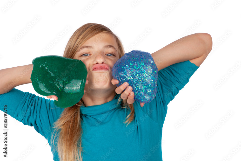 Funny girl posing with blue and green slime. Studio shot isolated on white background.