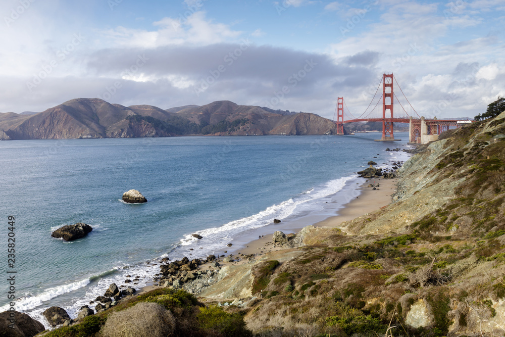 Marshall's Beach rugged shorefront with views of the Golden Gate Bridge and Marin Headlands. Coastal Trail, San Francisco, California, USA.
