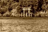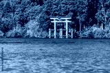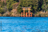 Mountain Fuji and Lake Ashi with Hakone temple and sightseeing boat in autumn