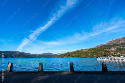 Mountain Fuji and Lake Ashi with Hakone temple and sightseeing boat in autumn