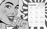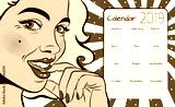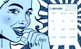 A calendar for 2019 in the style of pop art with a sexy blonde woman with squinted eyes and open mouth. Vector background in comic style retro pop art.