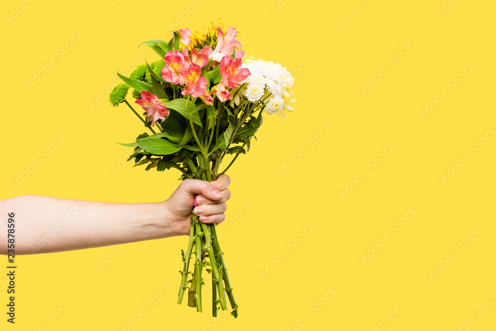 cropped shot of person holding beautiful bouquet of flowers isolated on yellow