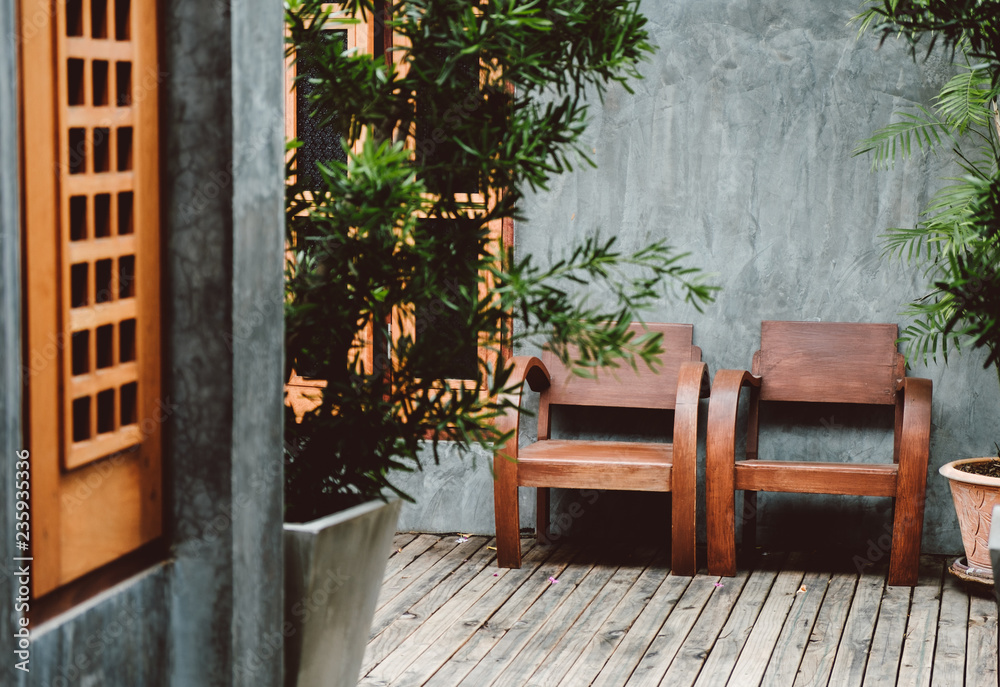 wooden chair in vintage house decoration with tree. Vintage loft decoration