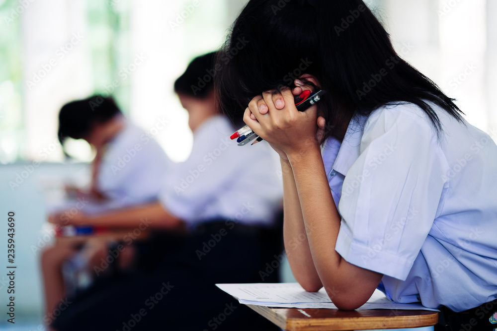 Hand of student holding pen and taking exam in classroom with stress