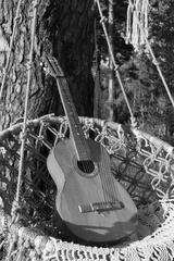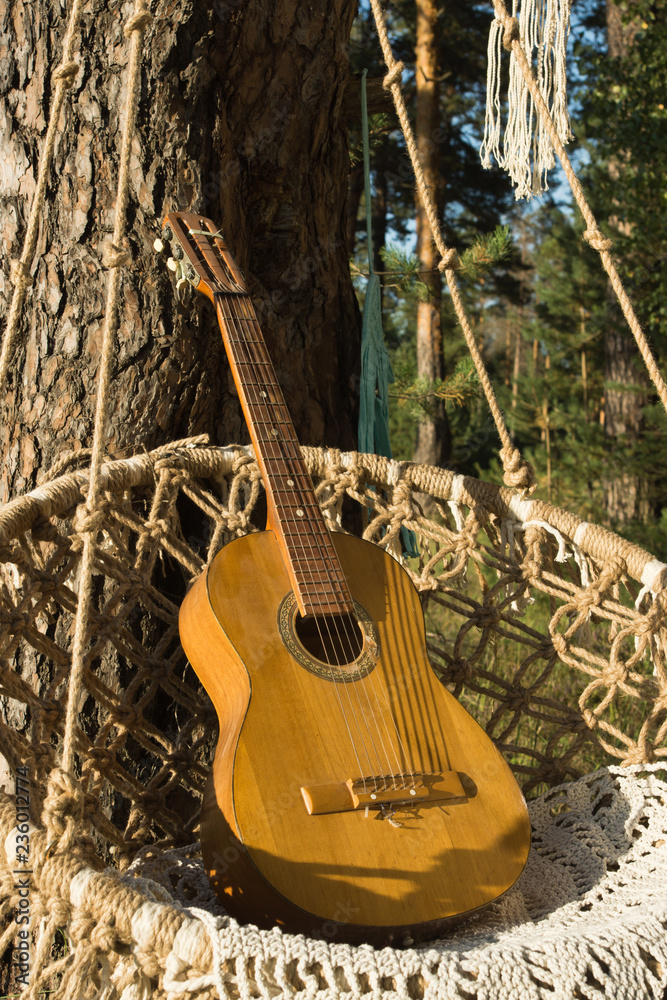 Guitar and dreamcatchers on a pine branch in the summer forest