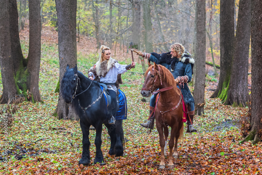 Northern warrior vikings on horses greeting with their axes before going on raid