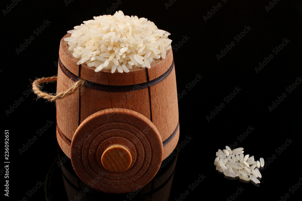 Barrel with rice on a dark background
