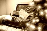 red suitcase and christmas tree decoration