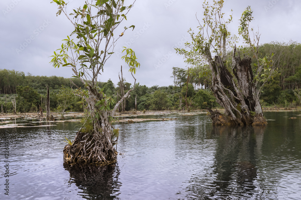 View of the bush in wetlands and reflection in the water