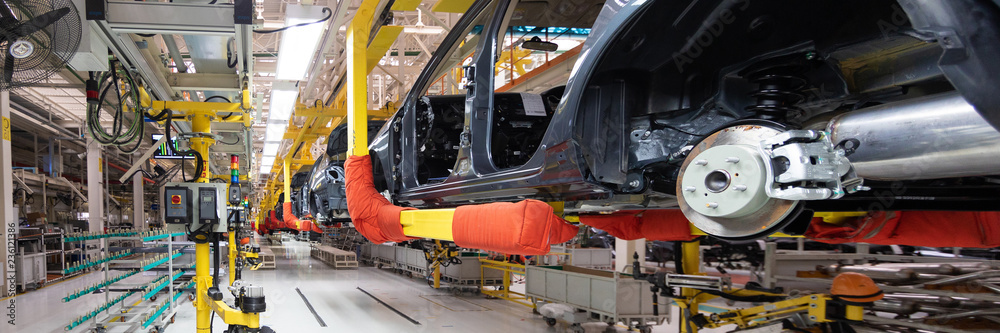 Automotive production line. Long format. Wide angle view of plant of automotive industry. Can be used as a banner