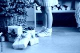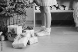 Little child girl is decorating Christmas tree with presents, gifts boxes. Kid in woolen knitted socks stands on warm floor with electric heating mat at home. Fir tree in blue basket