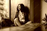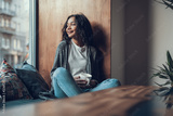Calm relaxed young woman looking outdoors and smiling while sitting on the window sill with a cup of tea in her hands