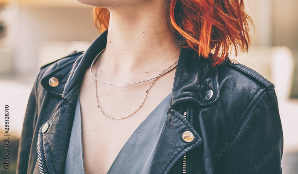 close-up of a fashionable woman wearing a minimalistic silver necklace