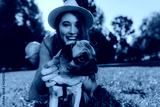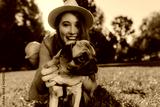 Close up of smiling woman in nice hat is holding lovely pug puppy in her arns