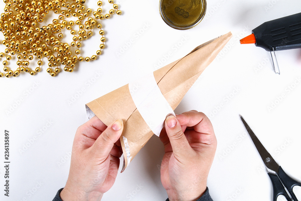 Diy golden Christmas tree from beads garland. Guide on the photo how to make a decorative Christmas tree from cardboard, stars, hot glue and beads with your own hands. Handmade. Top view on table.