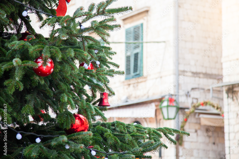 Christmas tree with red balls, bells, white ornaments, street decoration. Background of ancient architecture, window with wooden shutters in old town. Authentic festive atmosphere in Dubrovnik Croatia