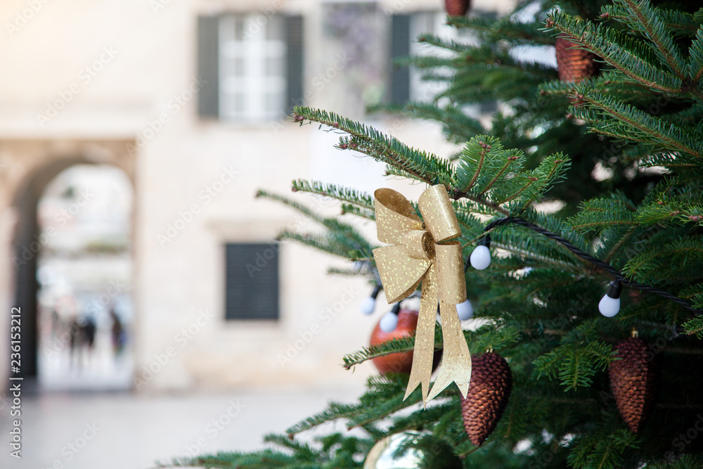 Christmas tree with golden bows and street decoration outside in old town with ancient architecture. Authentic festive atmosphere in Dubrovnik, Croatia.