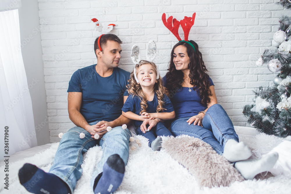 Christmas family photo. Father, mother and daughter are wearing christmas funny horns.