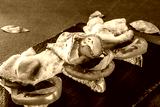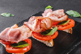 Appetizer bruschetta with prosciutto, ham, tomatoes and spices on black shale board over black stone background. Healthy food concept