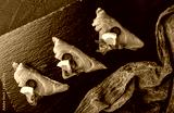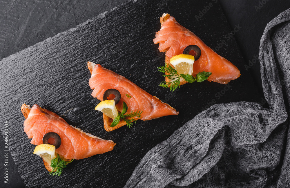 Appetizer bruschetta with fillet salmon, olives and lemon on ciabatta bread on stone slate background. Healthy food concept, Top view, flat lay