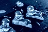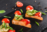 Appetizer bruschetta with vegetables, tomatoes and spices on black shale board over black stone background. Healthy food concept