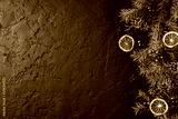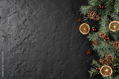 Christmas decoration on holiday background with Fir branches, pine cones, red decoration, spices. Xmas and Happy New Year theme. Flat lay, top view, space for text