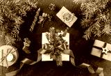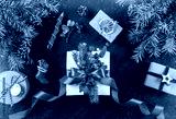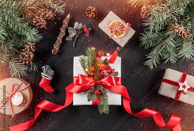 Christmas gift boxes with red ribbon on holiday background with pencil, Fir branches, pine cones. Xmas and Happy New Year card, bokeh, sparking, glowing. Flat lay, top view