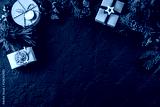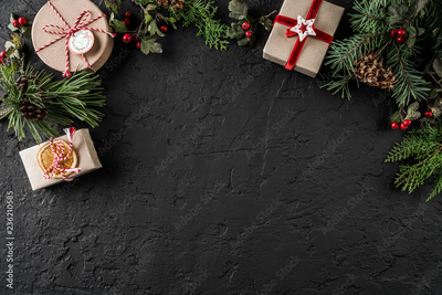Creative layout frame made of Christmas tree branches, pine cones, gifts on dark background. Xmas and New Year theme, snow. Flat lay, top view, wide composition