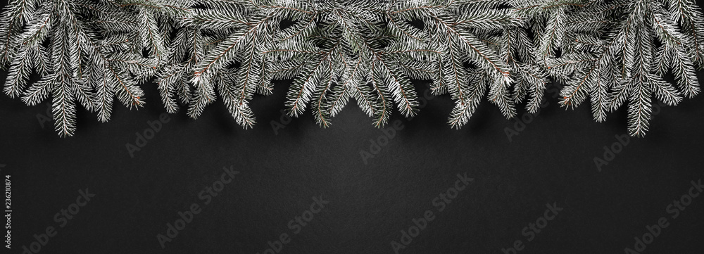 Christmas fir branches on dark background. Xmas and New Year theme, snow. Flat lay, top view, wide composition